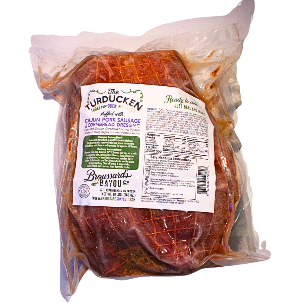 This 10 lb Turducken, generously stuffed with Creole Pork & Cornbread offers a delectable blend of turkey, duck, and chicken flavors. Perfect for large gatherings, this impressive centerpiece is ideal for any festive occasion or a substantial family dinner. Each turducken can be meticulously slow-roasted to ensure the meat remains tender and richly flavored, with the trio of meats and various stuffing options adding an extra dimension of taste and texture. Easy to prepare, it simply needs to be thawed and roasted, making it an exciting alternative to traditional holiday meals. Dive into something uniquely delicious and sure to satisfy any meat lover’s palate.