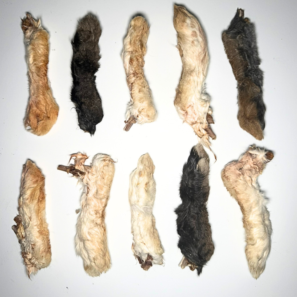 Pack Size: 10 dehydrated rabbit back feet (fur-on).