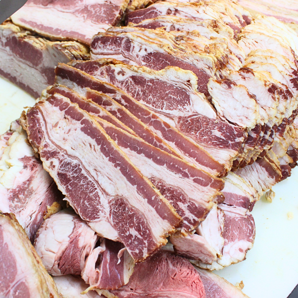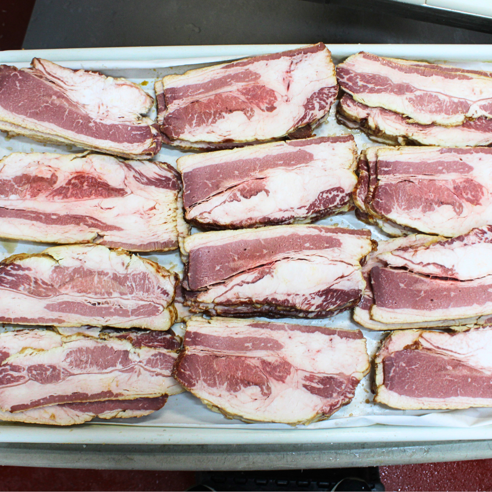 Unlike traditional pork bacon, our beef bacon is crafted from whole beef plate, then seasoned, cured, and naturally smoked in small batches right here at Mad Butcher Meat Company. The result: a thick, hearty slice with crisp edges, tender chew, and incredible smoky aroma — perfect for breakfast platters, sandwiches, burgers, or gourmet creations.